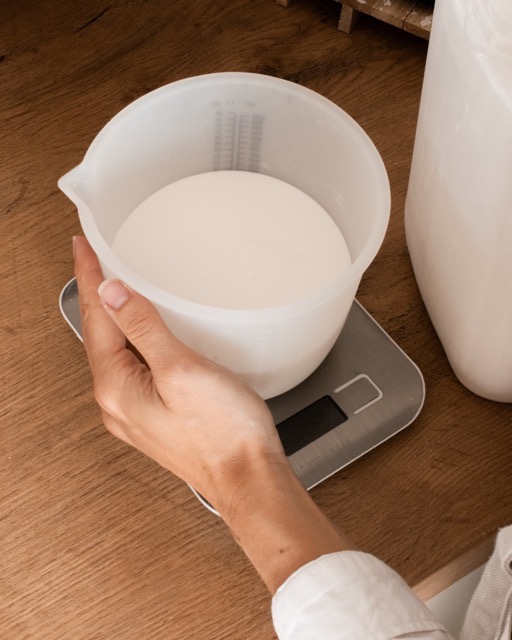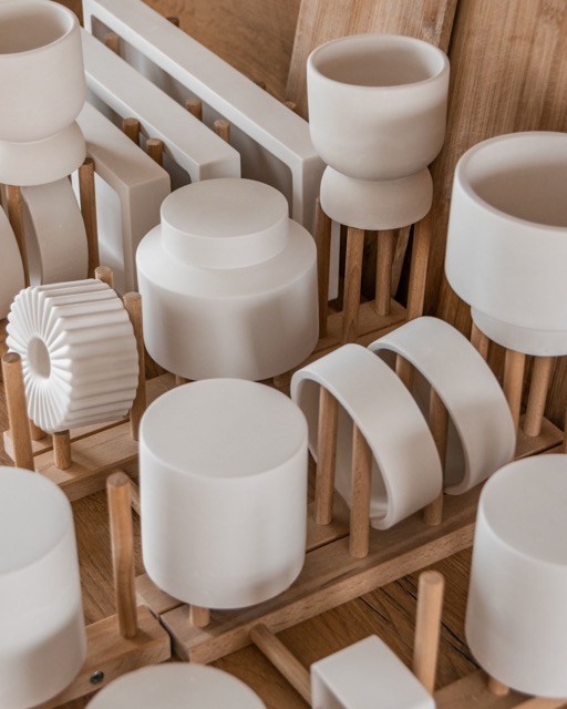 Der Prozess beginnt mit dem sorgfältigem Abwiegen und Anmischen der Komponenten. Jesmonite lässt sich präzise dosieren, ist angenehm in der Handhabung und gibt beim Gießen die Form so genau wieder, dass selbst filigrane Details erhalten bleiben. Einige unserer Objekte entstehen in selbst hergestellten Silikonformen. Jesmonite füllt diese Formen aus und bringt dabei das Design so zum Leben, wie ich es mir vorgestellt habe.